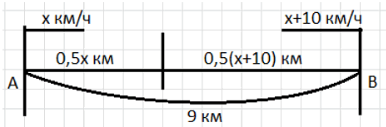а) Рассмотрим ситуацию, когда турист и велосипедист движутся навстречу друг другу с разными скоростями. Пусть скорость туриста равна \( x \) км/ч, тогда скорость велосипедиста на 10 км/ч больше, то есть \( x + 10 \) км/ч. Они встретились через 0,5 часа, значит за это время каждый прошёл определённое расстояние. Турист за 0,5 часа преодолел путь длиной \( 0{,}5x \) км, а велосипедист — \( 0{,}5(x + 10) \) км. Сумма этих расстояний равна общему расстоянию между пунктами А и В, которое равно 9 км.