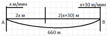 За 2 минуты первый пробежит \( 2x \) м, второй — \( 2(x + 30) \) м.
