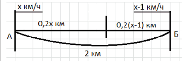 б) Пусть скорость Бориса равна \( x — 1 \) км/ч, тогда скорость Андрея — \( x \) км/ч. Они выходят одновременно навстречу друг другу и встречаются через 0,2 часа. За это время Андрей проедет путь \( 0,2x \), а Борис — путь \( 0,2(x — 1) \). Сумма этих расстояний равна расстоянию между домами, то есть 2 км. Составим уравнение: \( 0,2x + 0,2(x — 1) = 2 \).