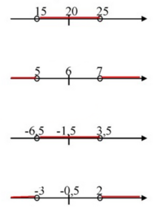 а) Неравенство \(|x — 20| < 5\) означает, что расстояние между числом \(x\) и числом 20 на числовой оси меньше 5. Геометрически это означает, что \(x\) находится внутри интервала, центр которого равен 20, а длина интервала равна 10 (по 5 в обе стороны от центра). Чтобы найти этот интервал, нужно решить двойное неравенство: \( -5 < x — 20 < 5 \). Прибавляя 20 ко всем частям неравенства, получаем \(15 < x < 25\). Таким образом, множество решений — все точки на числовой оси между 15 и 25, не включая сами концы.