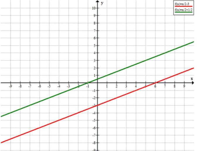 На основе уравнений и , можно заметить, что обе прямые имеют одинаковый коэффициент при (то есть наклон). Коэффициент при в обоих уравнениях равен , что означает, что эти прямые параллельны.