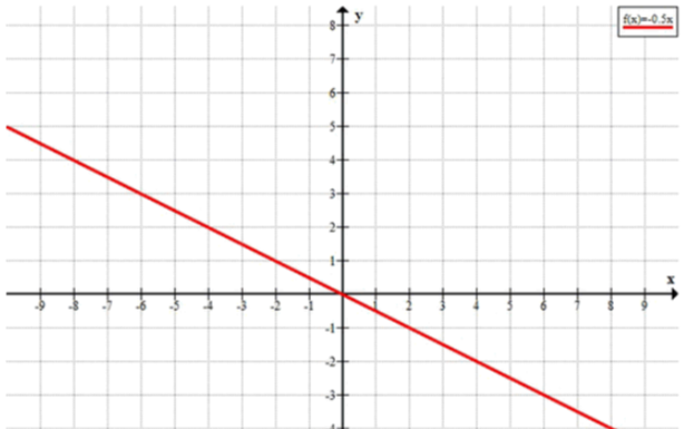 г) Уравнение y = -0,5x. Это линейная функция с угловым коэффициентом -0,5. При увеличении x на 1 значение y уменьшается на 0,5. График — прямая через начало координат с пологим наклоном вниз. Например, при x=4 имеем y = -2.