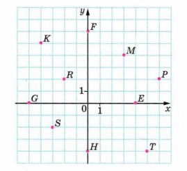 \(K(-4; 5)\), \(R(-2; 2)\), \(G(-5; 0)\), \(S(-3; -2)\), \(F(0; 6)\), \(H(0; -4)\), \(M(3; 4)\), \(P(6; 2)\), \(E(4; 0)\), \(T(5; -4)\).