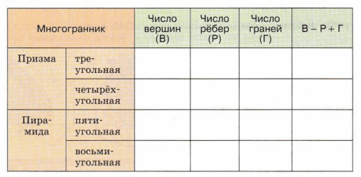 В данной таблице показаны разные многогранники — призмы и пирамиды, и для каждого из них указано количество вершин (В), рёбер (Р) и граней (Г). Для каждого многогранника проводится вычисление по формуле В – Р + Г. Это известная формула Эйлера для выпуклых многогранников.