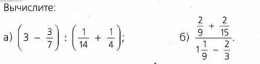 а) \(\left(3-\frac{3}{7}\right) : \left(\frac{1}{14}+\frac{1}{4}\right) = \left(2\frac{7}{7}-\frac{3}{7}\right) : \frac{2+7}{28} = 2\frac{4}{7} : \frac{9}{28} = \frac{18}{7} : \frac{9}{28} = \frac{18}{7} \cdot \frac{28}{9} =\)