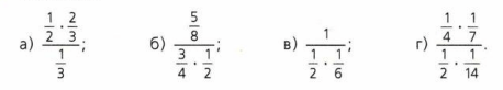 г) \(\frac{\frac{1}{4} \cdot \frac{1}{7}}{\frac{1}{2} \cdot \frac{1}{14}} = \frac{\frac{1}{28}}{\frac{1}{28}} = 1\)