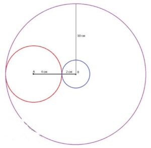 - Для внутреннего касания: |r₁ — r₂| = 4 см (разность радиусов первой окружности и второй искомой окружности).