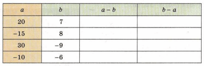 1) Перечертите таблицу в тетрадь и заполните её. В таблице представлены два числа, а и b, а также их разности в различных порядках. Рассмотрим, что получается при вычислении выражений a — b и b — a для данных значений: