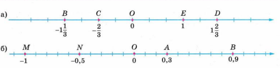 б) Начертите координатную прямую с единичным отрезком, равным 6 клеткам. Отметьте на ней точками числа: \(\frac{1}{2}; \frac{2}{3}; 1 \frac{1}{3}; -\frac{1}{3}; -1; -1 \frac{1}{2}.\)